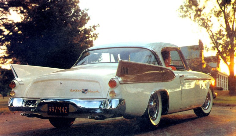 I know that there are folks on this forum who love the Hawks with their open maw grill and stuck on tailfins. I’m just not one of them. The Bourke/Loewy 53/54 was iconic, timeless, stunning, innovative. The Hawks were just ‘follow the crowd’ and tart up a design that didn’t need tarting up. Fins are in, so here are ours. Don’t know where they got the idea for that ginormous grill…either Chrysler stole it from them or they stole it from Chrysler, but can you say non-aerodynamic! Ugh.