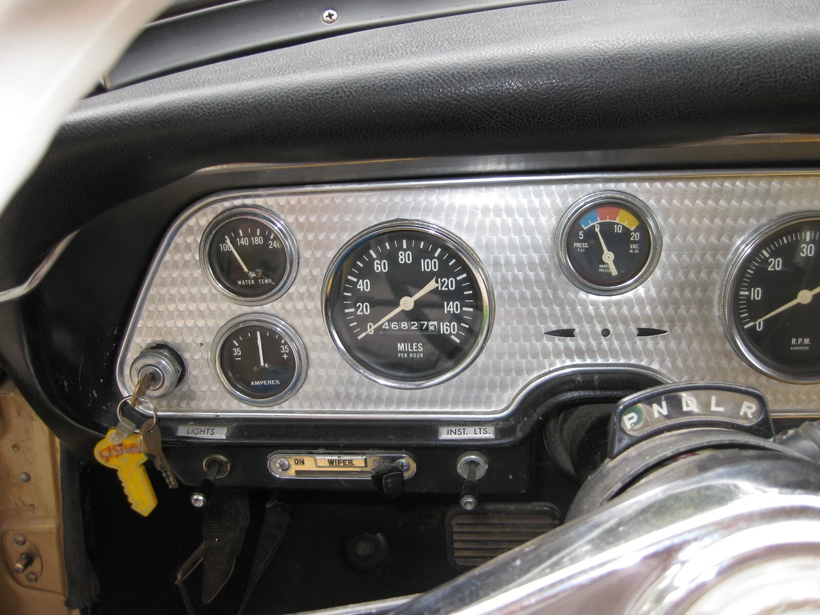 Based on the pictures I’ve seen, I’d say that the Hawk was refurbished at some point decades ago. The paint is obviously older and the upholstery doesn’t seem to match any Golden Hawks I can find in my research. Additionally, the trunk emblems are not located in the original location, so somebody has done some mild customizing along the way. Aside from its supercharged 289 and glamorous styling, one of my favorite things about the Golden Hawk is its engine-turned dashboard and full instrumentation. Studebaker instrument panels of the late-’50s and early-’60s always looked like the best race cars America had to offer.