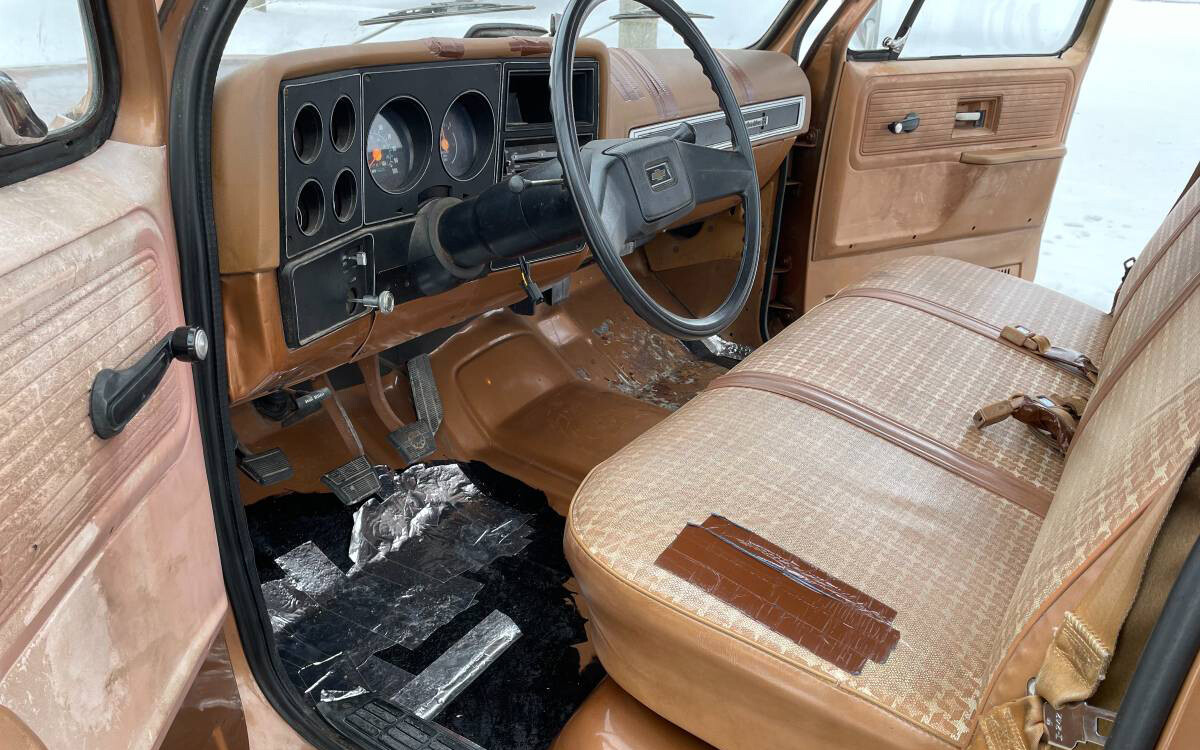 I can’t help but think that there may have been some bodywork on the rockers at some point. If you zoom in on the gap between the rockers and cab corners, it’s a little goopy, or maybe that is, in fact, factory quality from 1979. The floors are the big thing here, so there is some rust to deal with underneath unless it’s been repaired already, but there’s no mention of that. The seat cover is a non-issue, and this C10 has a three-speed manual with a column shifter, as you can see.