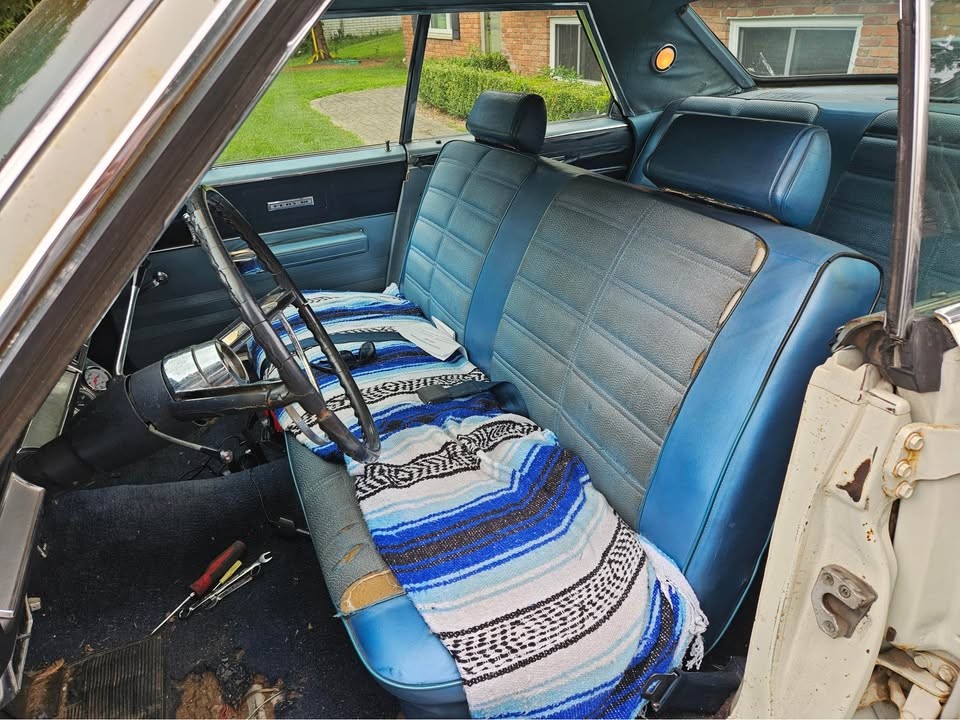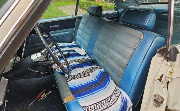 The interior is a work in progress, as evidenced by the blanket covering the worst of the damage. The Fury III was only one step down from the top-of-the-line VIP in the Fury luxury car hierarchy, so a little reupholstering and perhaps a new carpet could leave a new buyer with a comfy hot rod.