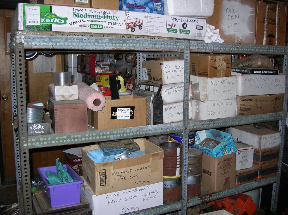 The two sedans are peeking at us nose-first. One has a new mohair interior – I’m going to guess that’s the black one but we don’t know since there’s no photo. The black sedan does look salvageable, with nice shut lines and all its lenses intact. The snazzy grille lines – extending along the car’s flanks – were one of the best features of this model – and here, you have at least three intact grilles! The package includes at least four 330 cu. in. Hemi engines along with cranks, heads, camshafts, bearings, valve covers, manifolds… This barn provides a veritable cornucopia of motor bits.