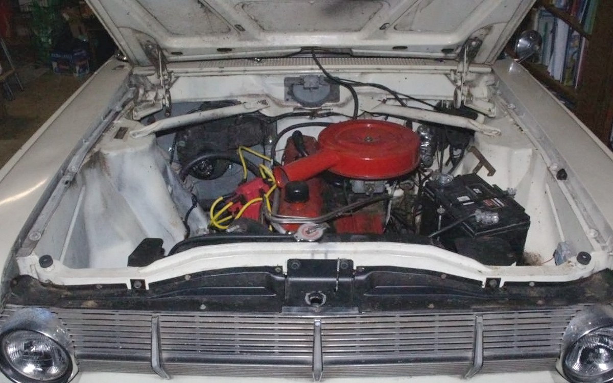 The interior and the seats look great other than the carpet and the missing glove box door. This one has a Borg-Warner three-speed automatic with a column shift. The seller is moving so that’s why they have to sell this one and they mention that the “original imitation vinyl roof and body could be repainted.” I’m not sure what that means about the vinyl roof as it appears to be perfect in the photos. You can see something happening above the right rear wheel and possibly on the bottom of the right quarter panel but they say that there is “almost no rust”.