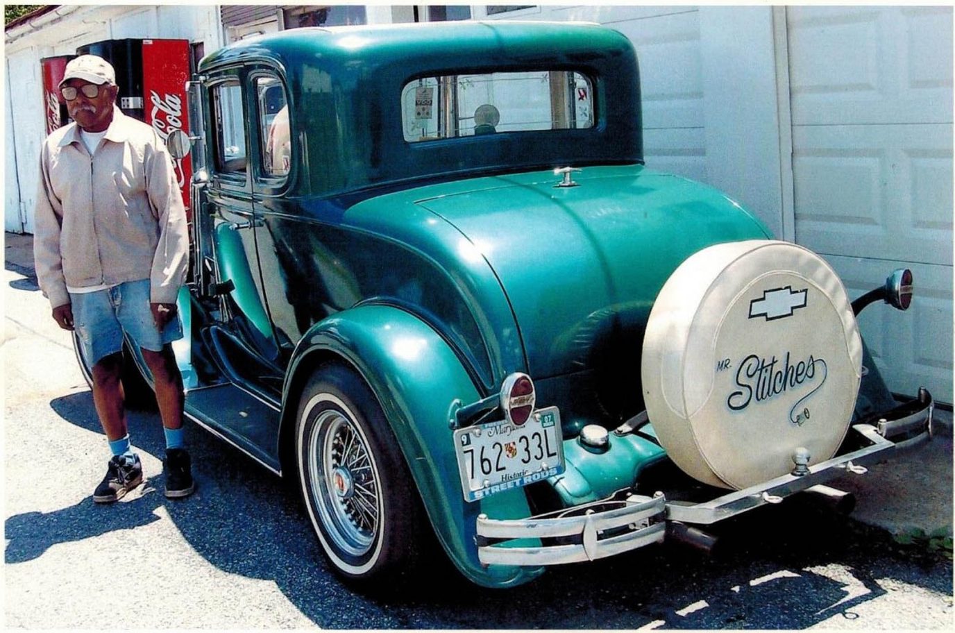 After retiring from drag racing in the 1960s, Johnnie Gaither continued enjoying and maintaining Mr. Stitches, keeping the 1931 Chevrolet at his upholstery shop when not in use. He showed the car at many local events up until the early 2000s. Pictured here is Gaither next to Mr. Stitches, sometime before an unthinkable tragedy struck.