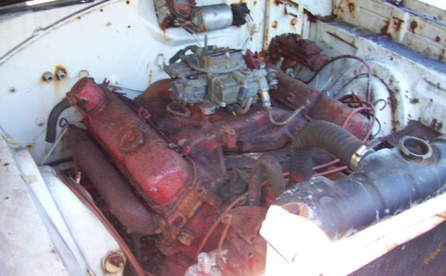 Blue-ish primer and gloss black paint are everywhere (covering what may have been white or light blue eons ago). The passenger floorboards look okay, but may have been repaired. You can barely see out of the windshield, so that’s gotta go. The back glass got busted out, but the sale includes a replacement. The bucket seats seem to have been swapped for a non-matching bench that needs help. Don’t get your heart set on the aftermarket wheels, as they aren’t part of the deal. If you happen to own an excavator, the seller might entertain a trade.