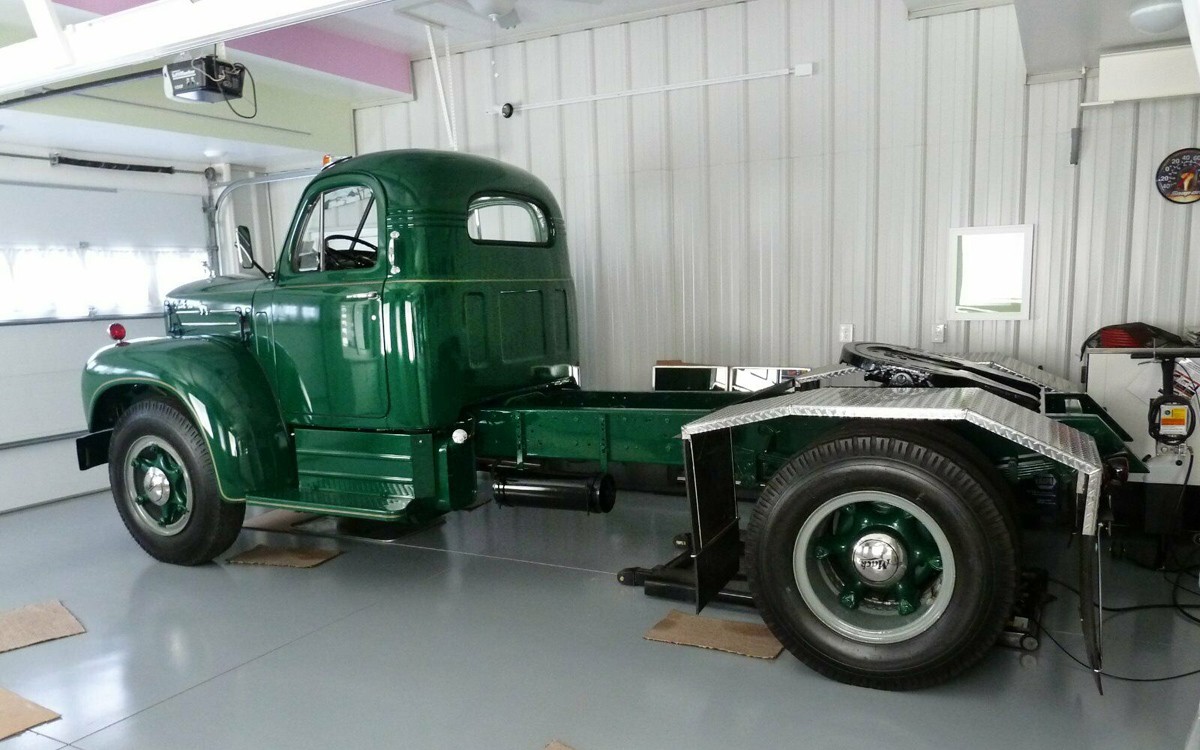 Hey Rube, got to say this is a good looking Mack,agree tubeless wheels – tires would be better just not period correct. I grew up with split rims and yes they can be killers if not handled properly. Rust in the snap ring itself and the grove it engages with on the rim causes all the trouble.I always grind these two areas clean of any build up to ensure a proper fit . Also bolt the wheel back on the axel before air is applied,use a clip on chuck and stay away as tube inflates,use a regulator in the line to get the proper pressure. Have never had one blow up using these methods and won’t be nearby if it does.