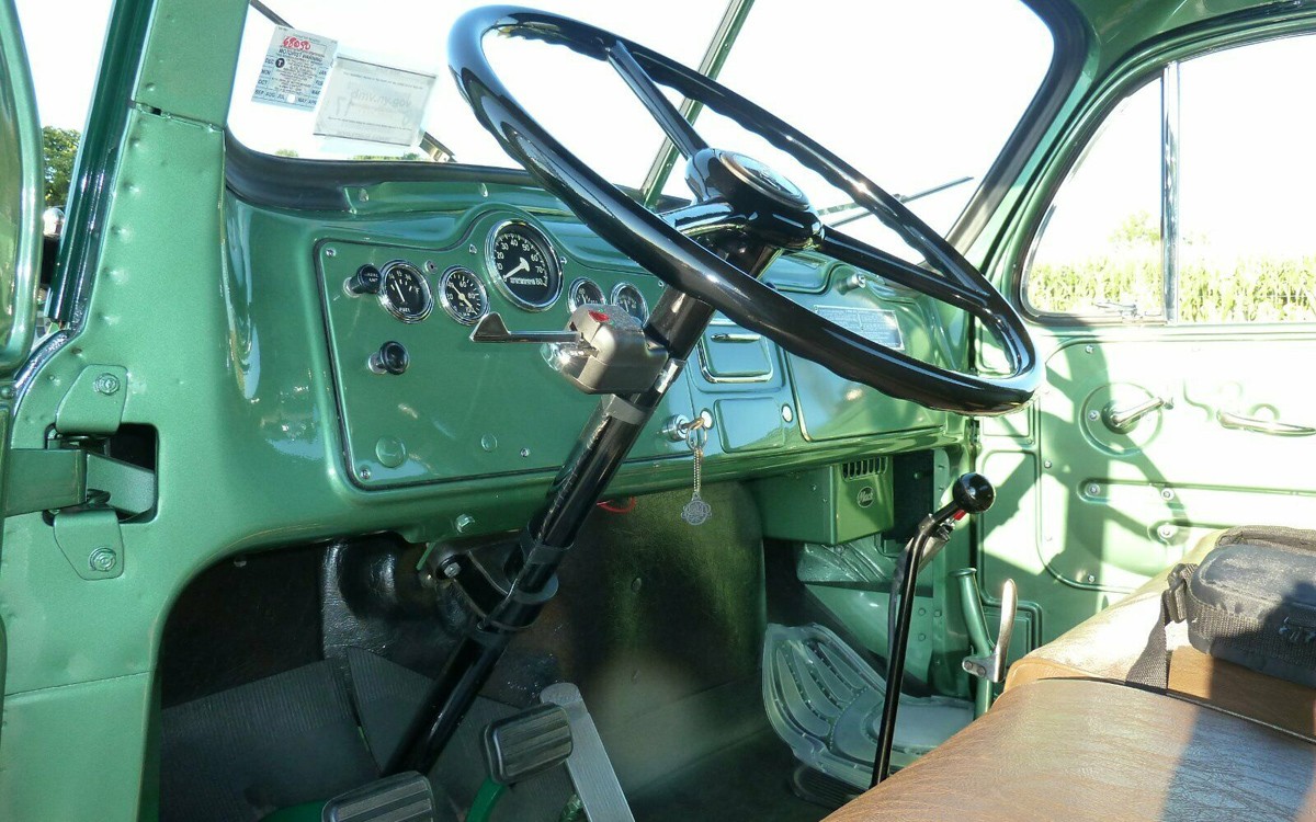 Wow, they aren’t lying when they say that this is a museum piece. The interior is incredible and some of you know that this is a gas-powered truck due to the somewhat sparse gauges shown here. There’s no automatic here, it’s a 5-speed transmission and buyers had a choice of single-reduction, dual-reduction, or two-speed rear axle and several different ratios depending on how the truck would be used.