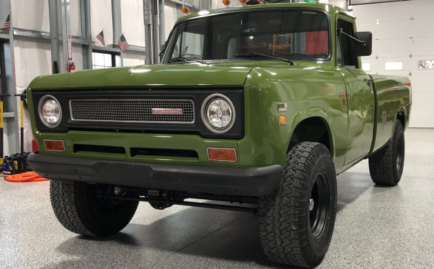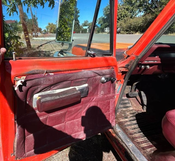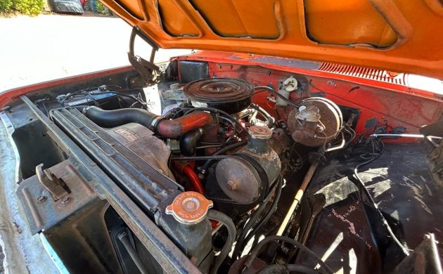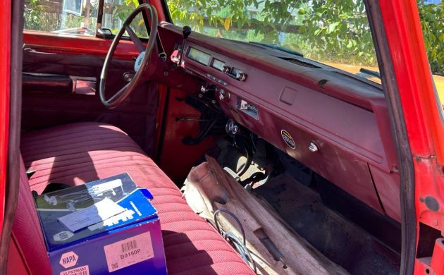 A replacement 345 cu. in. V8 engine resides underhood. The engine is said to run well, but it suffers from “fuel delivery problems.” A new fuel pump box (Napa) is sitting in the passenger’s seat and the fuel tanks have been flushed, so apparently, a fix has been attempted. The gearbox is a Borg Warner three-speed automatic, and of course, this is a four-wheel-drive rig. The nomenclature tells us it’s a 3/4 ton: International assigned 1010 and 1110 to its half-ton, 1210 to the 3/4, 1310 to the one-ton, and so forth. This truck was built for hauling, not for speed, with just shy of 200 hp from the engine, but over 300 lb-ft of torque.