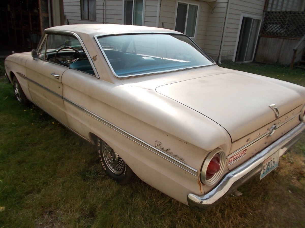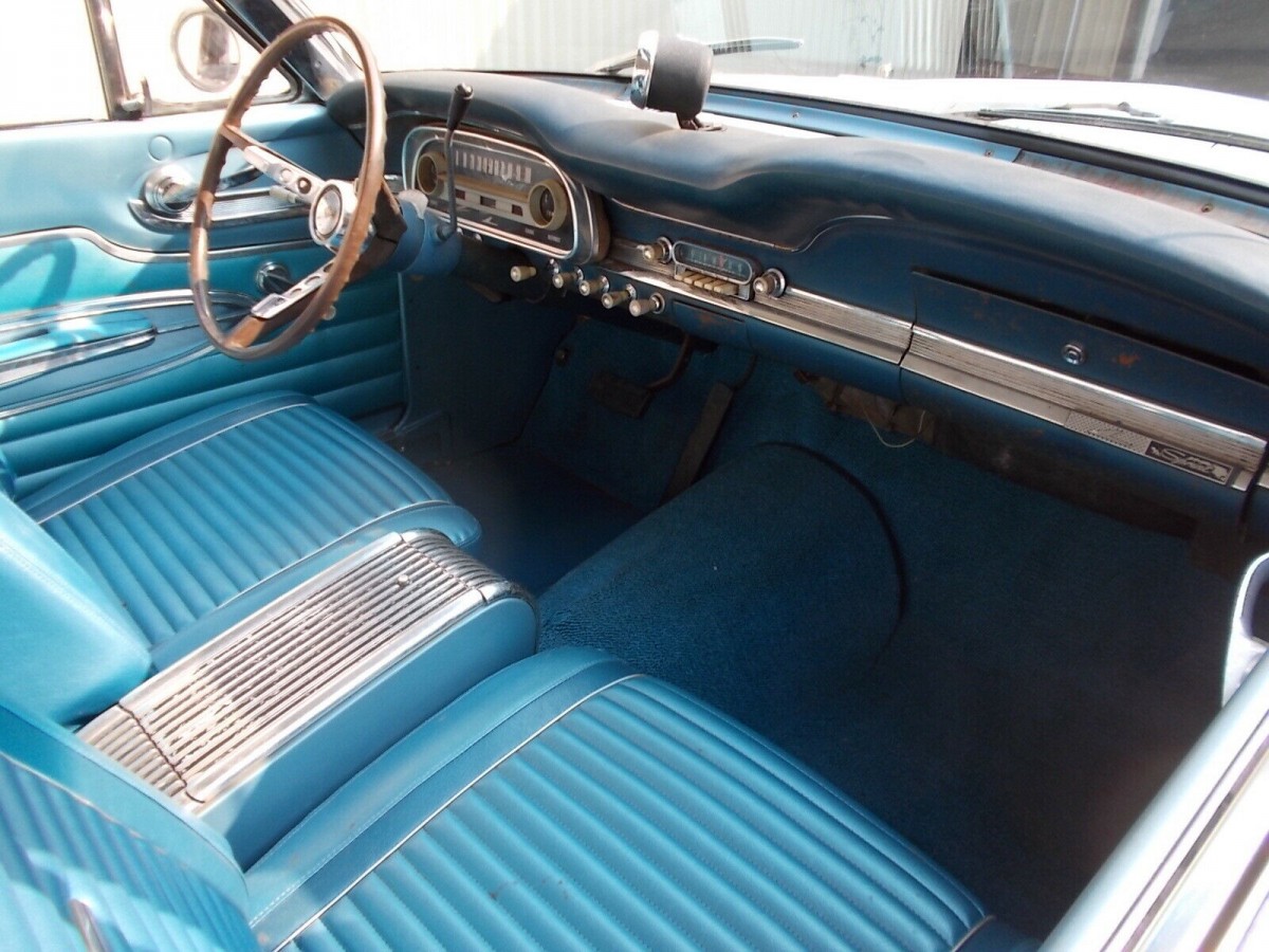 While we don’t what the seller’s 1963½’s Falcon Spring has been up to the past 57 years, it’s largely done it well. The body looks pretty good, but it carries an older paint job, one where someone changed the color from Metallic Viking Blue to white (not a good idea in my opinion; color changes usually devalue a car). The front floor pans and toe boards were replaced at some point, but the rear floor pans and the metal below the rear seat are rusty and will require some work. A photo from inside the trunk gives a hint to the original color as that patch of blue was not camouflaged. Since the car needs painting again anyway, go back to the original color.