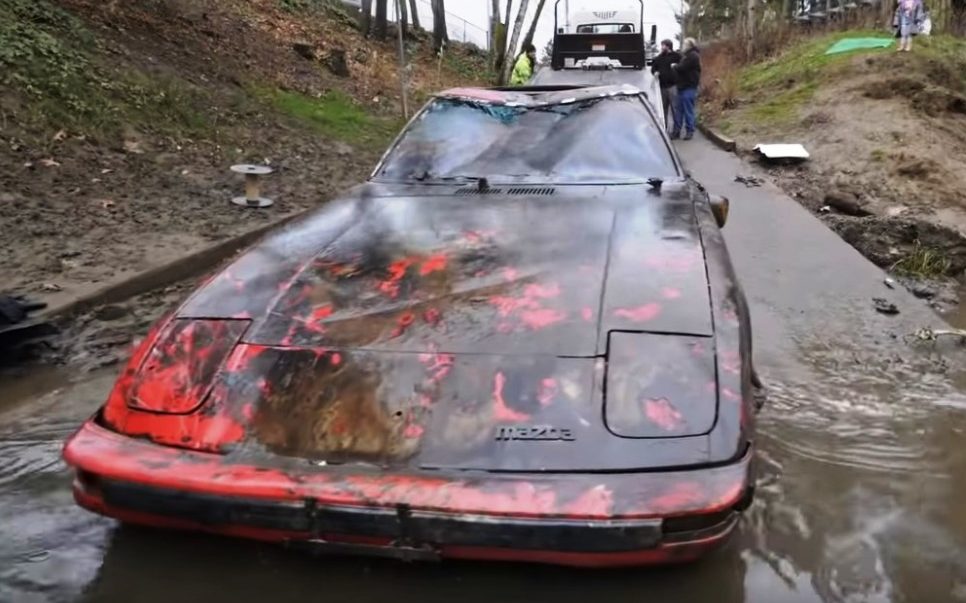 This Mazda RX-7 proved easier to extract than the silt-laden Mustang. Of the more than 750,000 cars stolen in the U.S. in 2018, only 59% were recovered. Not all of the rest were driven into rivers and lakes, but some were! An underwater grave quickly erases evidence of crimes. This recovery crew took time to check for human remains before casually yoking these potential crime scenes from the deep.