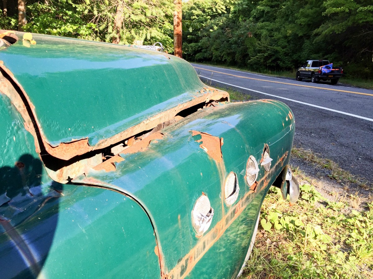 From Art – I was on my way to go kayaking at a small lake up in the Helderberg‘s which is near Thatcher Park. The lake was Thompsons Lake a small lake that you could kayak three or four times because it’s just a big circle. The car was just sitting on the side of the road down from an abandoned house. To me, it was a work of art. I always love to see these cars only because they are so beautiful in whatever state they are in.