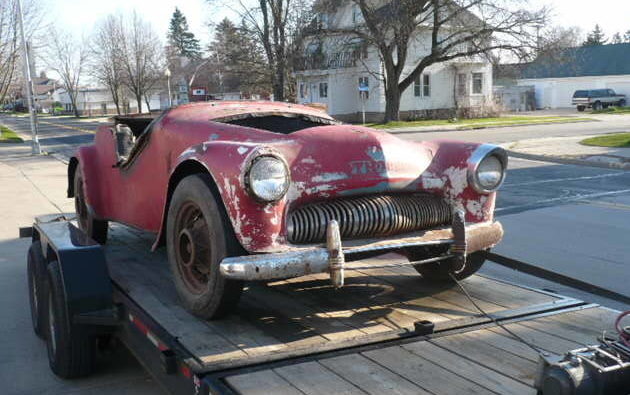 The seller tells us that the front end is from a 1950 Mercury but that it has been blended into the rest of the body with both fiberglass and lead. The windshield is from an unknown car and the cut-down sides take the place of having doors for access. With the full-width nose but separate fenders, the car certainly has a unique appearance. It’s grown on me in the hours since I first saw these pictures.
