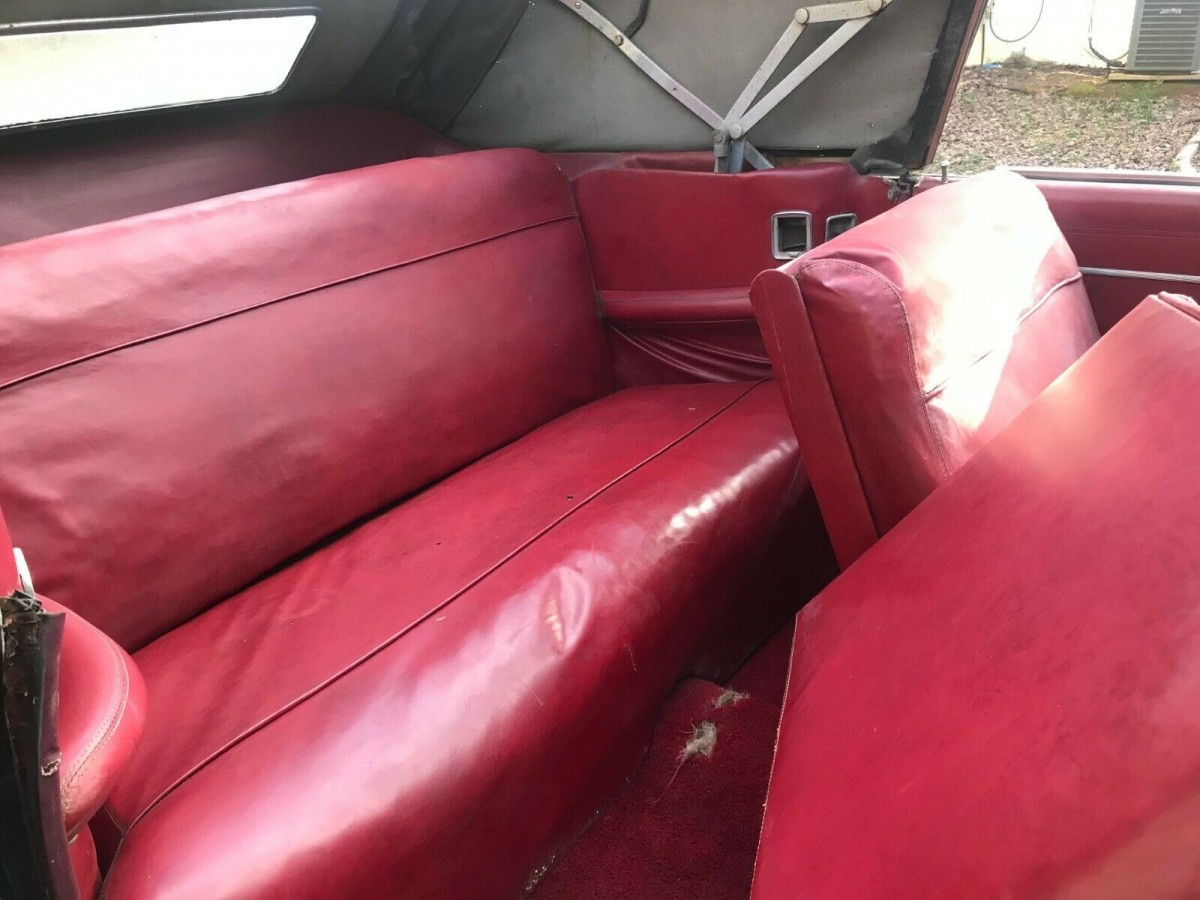 But…“The car needs restoring. Interior and paint needs to be restored. Looks good in pics but paint is bad.” That’s borne out by the photos, too. The interior is messy but not horrible—it’s supposed to be leather and whipcord or custom cloth. It could be the original leather, but if so it’s going to need total replacement. I think I see a clutch pedal, so probably the three-speed manual. The right rear tire is flat, and there’s missing trim.