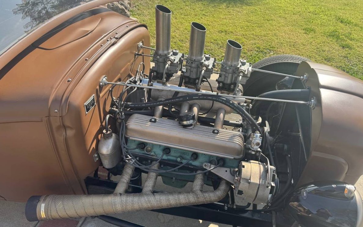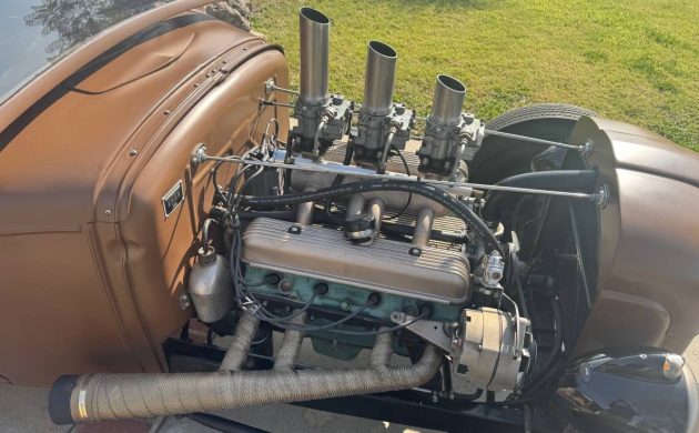Triple Rochester carburetors top a heat-isolated Log Intake for flow and towering height. Check out that cleverly adapted firewall-mounted Army surplus aluminum canteen! I carried a similar unit on many hikes. A nifty 1960s Super Turbine “Switch-Pitch” 400 automatic transmission provides crisper acceleration and better economy than most three-speeds of the day.