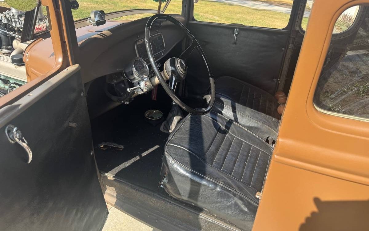 A ’40 Ford style steering wheel has been a popular swap since the Eisenhower era. Simple vinyl upholstery covers the rudimentary interior. The tilt-out windshield provides speed-conditioned air while traveling.