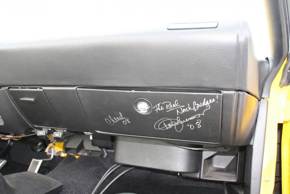 As part of the restoration, the car maintained several unique Nash Bridges features, i.e., fender tag, dashboard flashing red light, shaker hood, pistol grip automatic transmission shifter, and Don Johnson’s and other cast members’ autographs on the glovebox. The car also retained the original camera mounts and cords used during the production of the show. The one big change that took place is that a period-correct 426 Hemi engine was dropped in under the hood, which Chrysler rated at 424 hp. The seller kept the original 440 that we’re told came out of this ‘Cuda.
