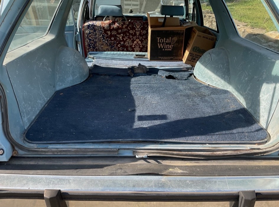 The interior is plagued by torn carpet, a broken driver’s side window crank, non-working AC, a fuel gauge that won’t register, burned-out dash lights, and a heater that only heats when the setting is on “defrost”. The headliner is missing. The cargo area plastic panels are beat up. Oh, and the dash is cracked. But we’ve all seen worse!