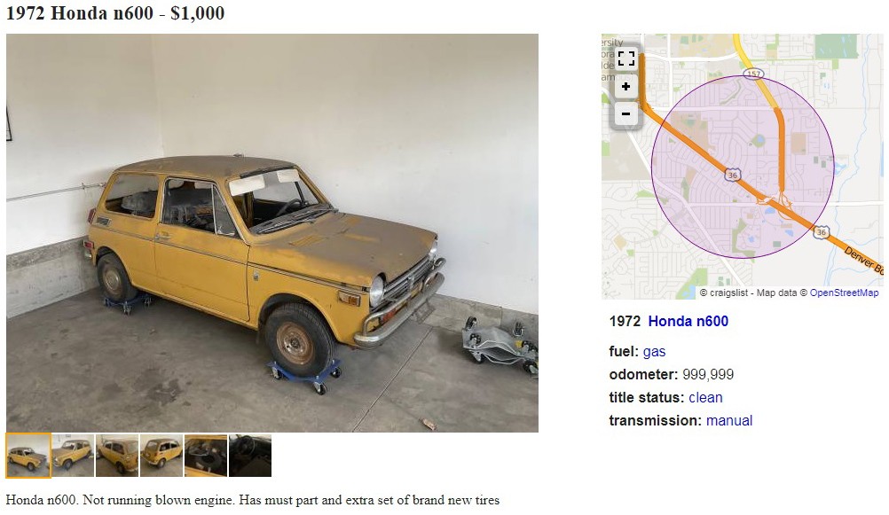Coming to market less than a decade after Honda started developing a car rather than concentrating on motorcycles, the N360 was introduced with an engine size that was friendly for buyers in Japan who got Kei class tax breaks because of the displacement and vehicle size. This 1972 Honda 600 Sedan (as they were called here) is posted here on craigslist in Boulder, Colorado, and the seller is asking $1,000. Here is the original listing, and thanks to Mike F. for the tiny tip!