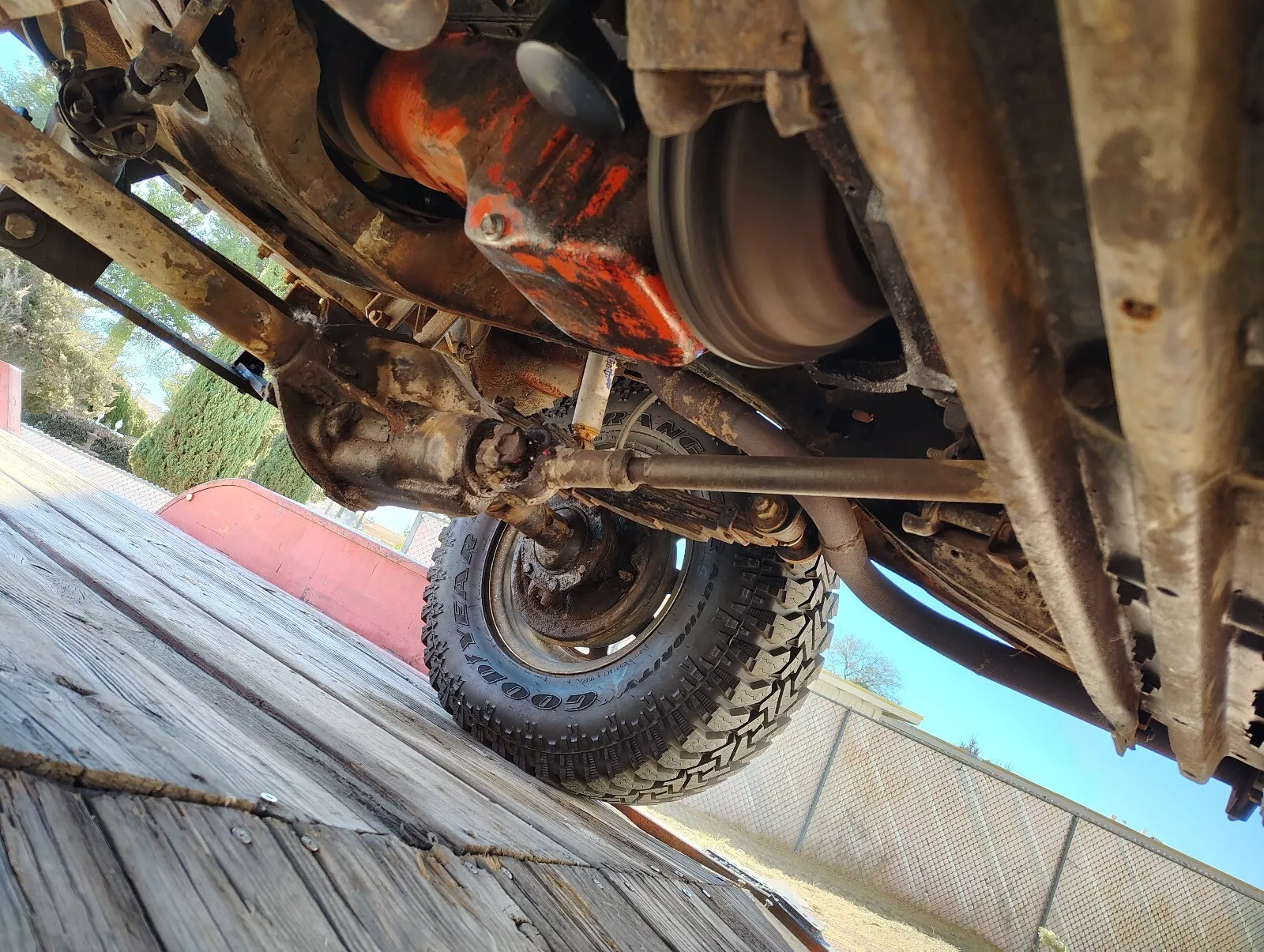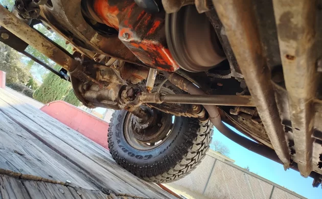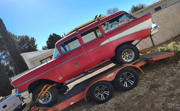 Well, I’ll tell ya’, we seem to dismiss these “creations” as weekend alcohol induced visions, but I take the road that they were really fixed on making a 4×4 ’57 Chevy wagon. I think it’s really cool. The thing is, when adding a front drive axle, we don’t have the luxury of 15 engineers in a company setting, so many alignment and other issues arise, many times it , like I suspect here, turns out badly. Unsafe even. So, what I would do is, I like the way it looks, just ditch the whole 4×4 thing and run a real front suspension( Mustang II ?) and have a neat car.