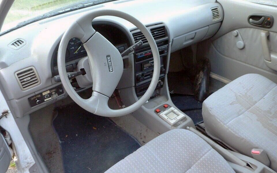 Hey, where’s the shifter?! Actually, the Solelectria had a forward/reverse push-button for moving out so there’s no gear shifter. This is the only interior photo other than this one showing what I’m guessing is part of the battery storage area, but it looks pretty good inside from what I can see. The seller talks about this car being solid as far as the chassis goes and says that there is no rot or rust in that regard, but they mention some rust on the body and it’s clearly visible, especially on a white car. A lot of these cars were purchased by public utility companies such as cities or power companies, etc.