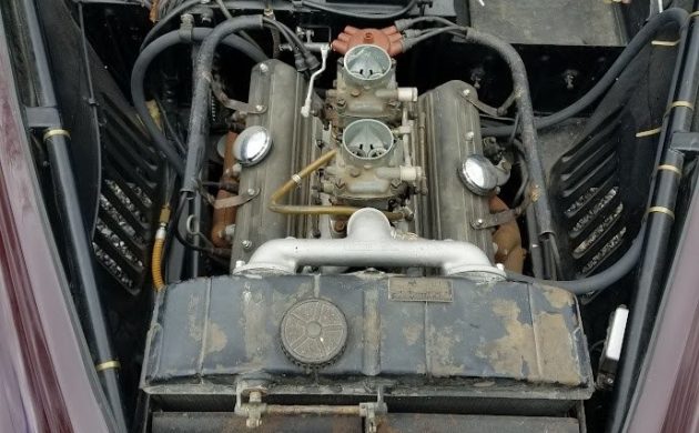 Lancia’s engineers employed sophisticated techniques to solve issues like front/rear balance, engine power vs. weight, how to configure brakes, and the best way to marry up suspension with all the car’s other attributes. The result is a car with unusual solutions to ordinary problems, pretty much from top to bottom. The narrow-angle V6 displaces 1754 ccs and generates about 56 hp. Ordinarily supplied with a single carburetor, this example seems to have a Nardi kit partially installed, with dual Webers, a special intake, and a twin-pipe water manifold. The kit typically includes a unique camshaft as well. The Nardi kit will supply another couple hp. Underneath, a transaxle combines the gearbox, clutch, and differential; the brakes are mounted in-board. This unit helps the car achieve a near-perfect front/rear weight ratio. Front suspension is sliding pillar, while the rear is independent. That mechanism attached to the front of the radiator operates shutters to help regulate warm-up temperature. This car is not in running order; the seller invites questions.