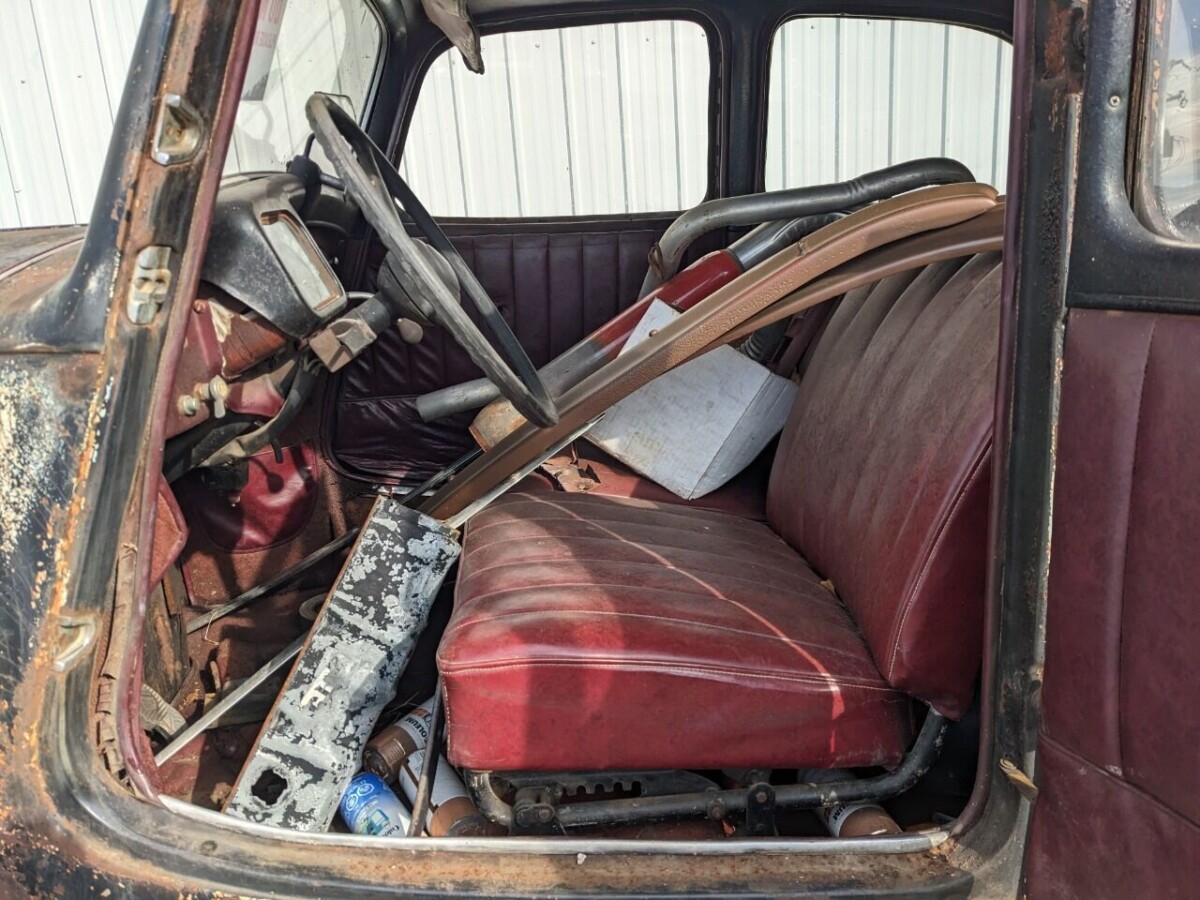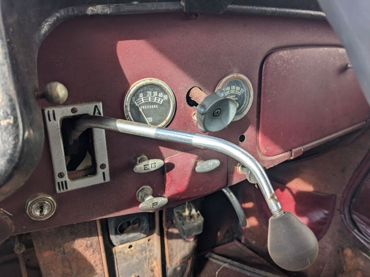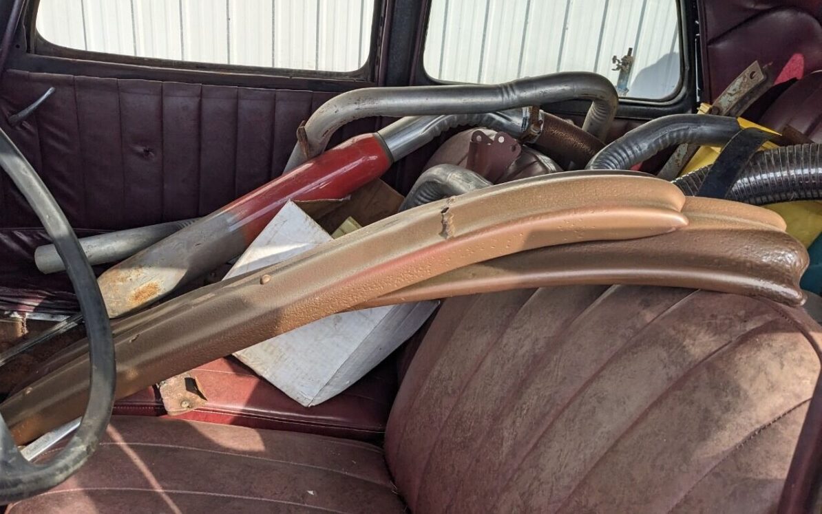 The interior is hard to describe, it looks like a Midas muffler shop in there. It’s not clear what kind of shape the upholstery is in because so much of it is obscured by detritus. From what can be spied, however, it may be in fair nick, just very dirty. The dash and instrument panel, with the odd, bent three-speed gear shifter, is an attention-getter. The interior says little about the floor condition but the underside images reveal a sound-looking structure.