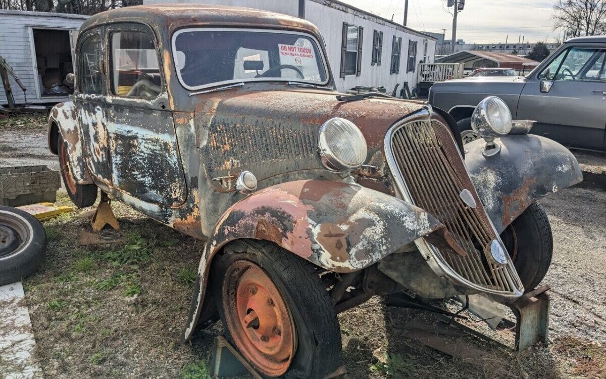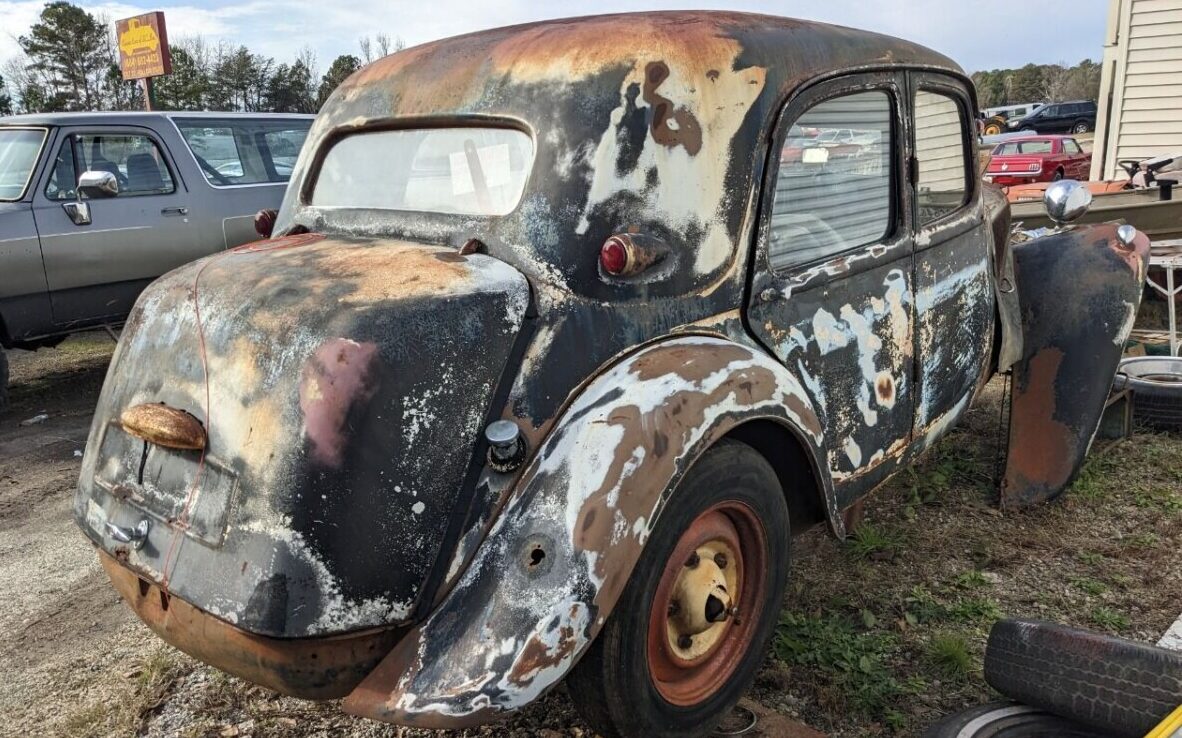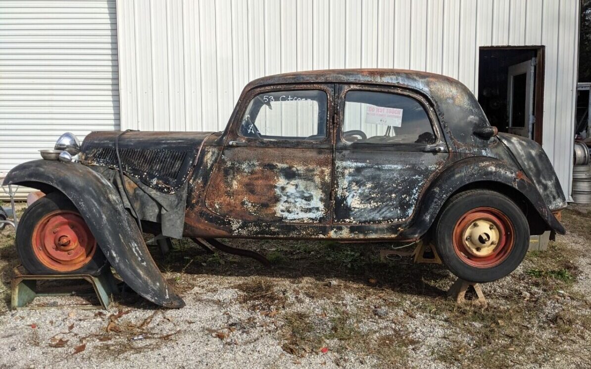 And now, for another HOC (Hunk O Car), this time in the form of a 1953 Citroen Traction Avant. Last week it was this Austin-Healey of unknown specificity, but today’s find, courtesy of T.J. is in a bit better condition; still, it’s rather deleterious. The seller tells us that this is a project car that, “needs finishing“. Finishing hmmm? Looks more like it needs starting but the devil’s always in the details so let’s see what’s here. Located in Gray Court, South Carolina, this beauty is available, here on eBay where it can be yours for $5,000. There is a make-an-offer option, and available layaway too!