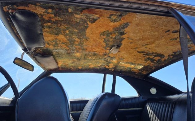 There’s nothing left of the headliner but glue. AMC advertising was always proud of its one-piece headliners, which were unlike the fabric-and-bow system most often used by its competitors. It might be easier to install but also possibly harder to find than a headliner for, say, a contemporary Chevelle or Torino.