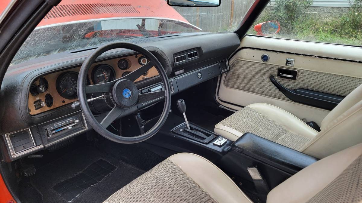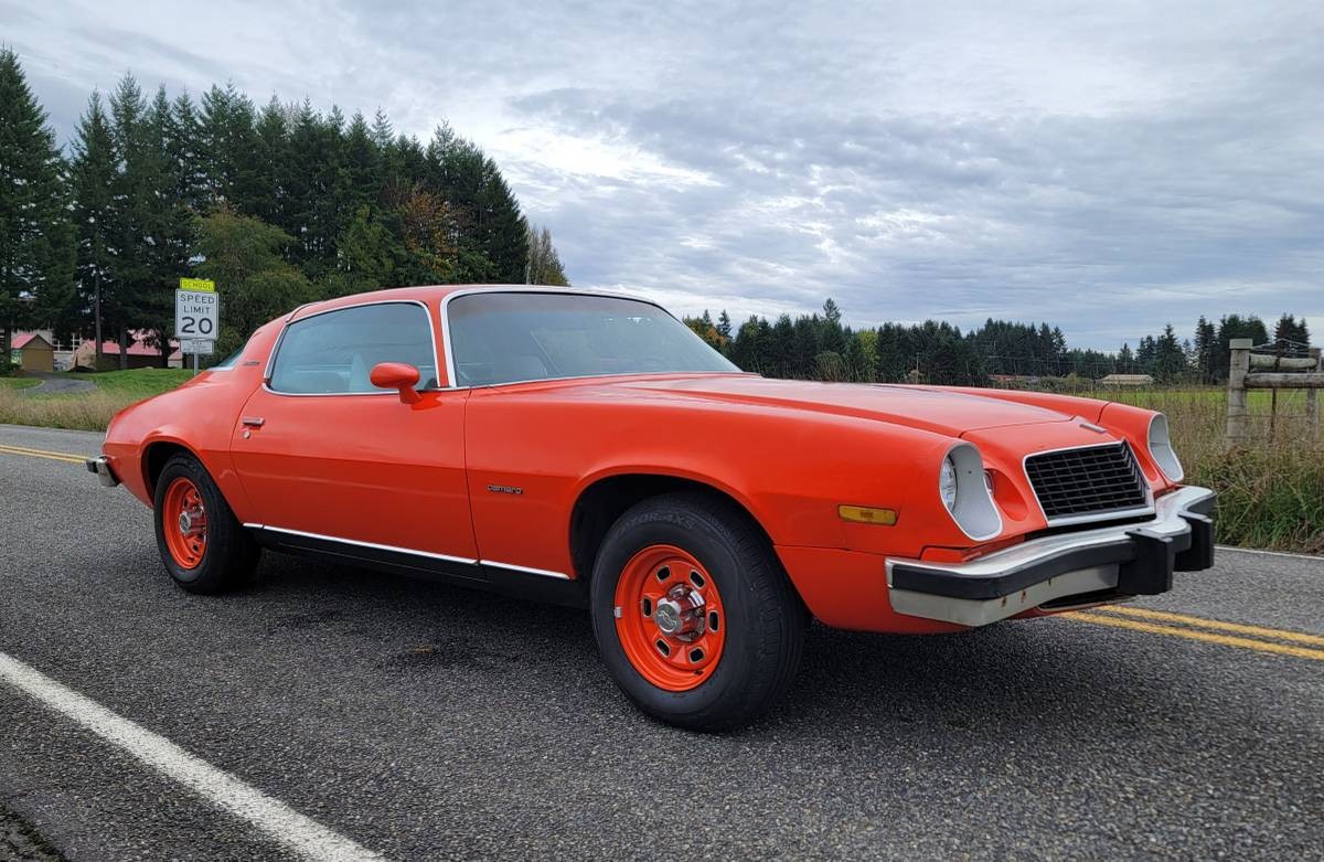 The new brushed stainless steel section on the rear of the car was new for the LT model. Power brakes were now standard and this car also has power steering. Despite the lack of a true performance model, the Camaro still sold well. Total units increased from 145,770 Camaros in 1975 to 182,959 units in 1976. The car rides on factory Rally wheels and the front suspension is said to be rebuilt. If orange is your color, this Camaro might be the one for you.
