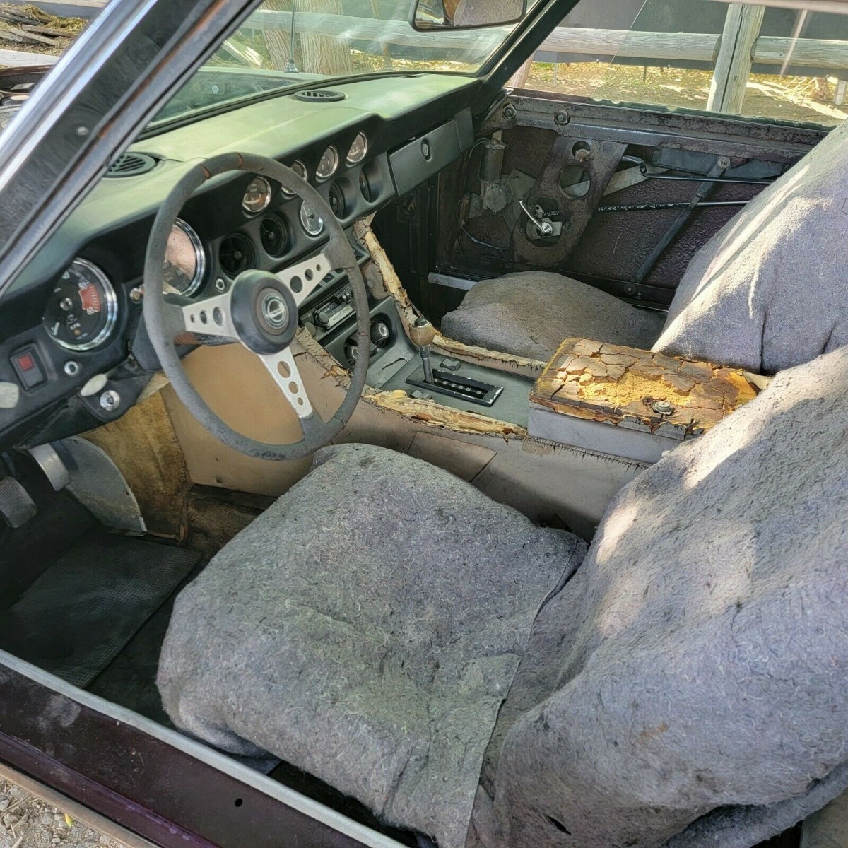 Jensens, like other British cars, had very high-end interiors when new, but they require a fair amount of upkeep to keep them looking good. As soon as they begin to get neglected, the cabin seems to suffer the worst. I notice the same trend in Lotuses, especially old Esprits which look like they’ve been blown apart inside after any amount of time exposed to the sun. The seller’s car is somewhere in between, with a torn-up center console lid and split surfaces on the center stack, but also clear gauges, an original steering wheel, and (hopefully) decent seats under those sheepskin seat covers. However, the seller does state point-blank that the interior is in rough shape, so it’s probably just wishful thinking that the seats could be preserved under there.