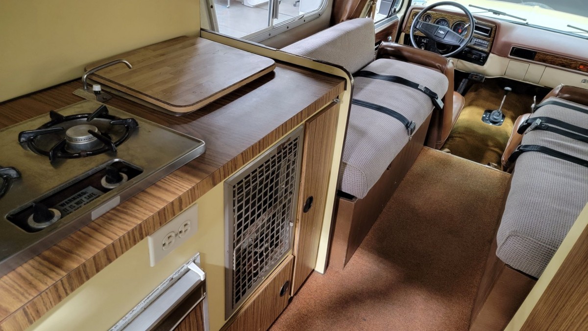 Wow – look at the cabin. Absolutely beautiful, and incredible to think it is unrestored. The seating surfaces are seemingly blemish-free, and the same goes for the carpets and cooktop surfaces. These vintage materials can look quite tired by now if the truck was used by someone who truly lived in it as opposed to treating it like the special occasion rig it is. The fake-wood surfaces can easily de-laminate in extreme temperatures, and I see none of that here. The carpets – well, carpets in cars that have been on the road for six months can look completely disgusting, so kudos to the previous owners that looked after this rare Chalet package truck. The seller descibes the various ways the top can be extended and the couches fold out for sleeping areas, and it occurs to you this was a brilliant package that was well ahead of its time.
