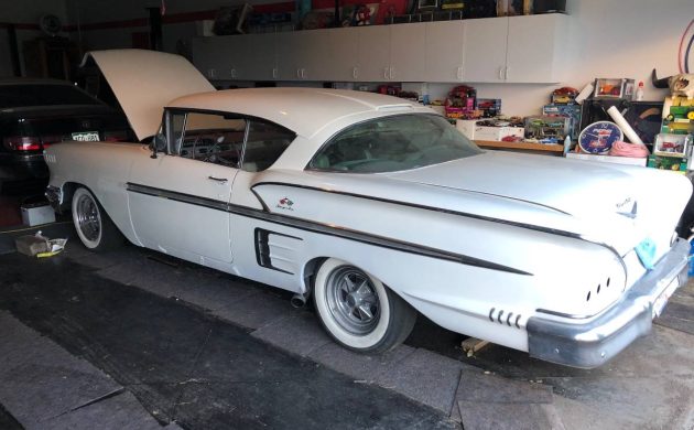 This mostly complete Impala has been owned by the seller for two decades. During that stewardship, the original 283 or 348 cubic inch V8 was replaced by a rebuilt 409 (“she’s so fine”) that was never driven for reasons not specified. The carburetor float is stuck now, and the battery is dead, so those are the minimum items needed to attempt getting this old Chevy going again. The automatic transmission also has overdrive (factory?).