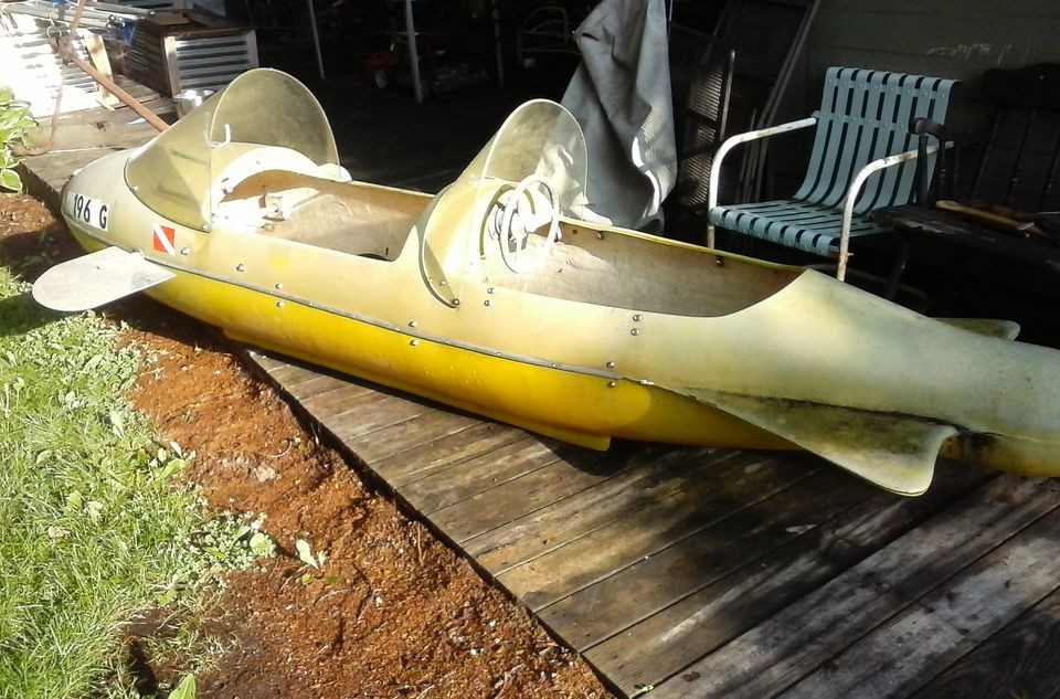 Ya’ll remember the WWII aircraft fuel tanks they would convert into racers? This looks like they took one of those tanks and made a fiberglass mold of it and then reversed the process to create these things. Pretty simple looking affair. I guess if you had a long way to go underwater this would keep you from getting as tired and using as much O2. I remember Yamaha had these underwater drones so to speak that you would hang onto and it would pull you through the water. Made for lazy swimmers. LOL.