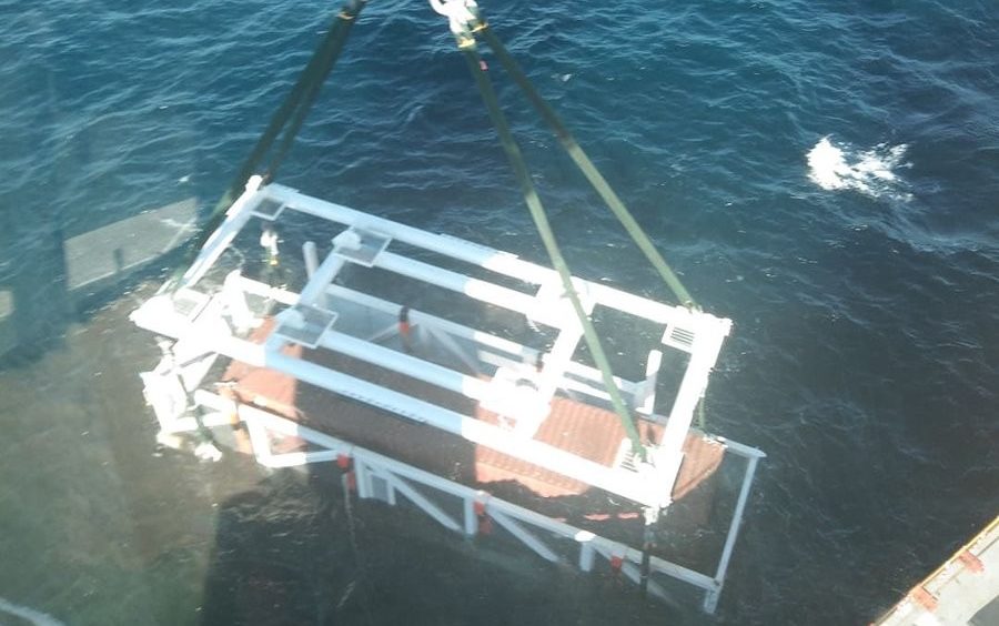 Here is one of the cargo containers surfacing after recovery. While it doesn’t look too large in this photo, this container is huge and weighs thousands of pounds.