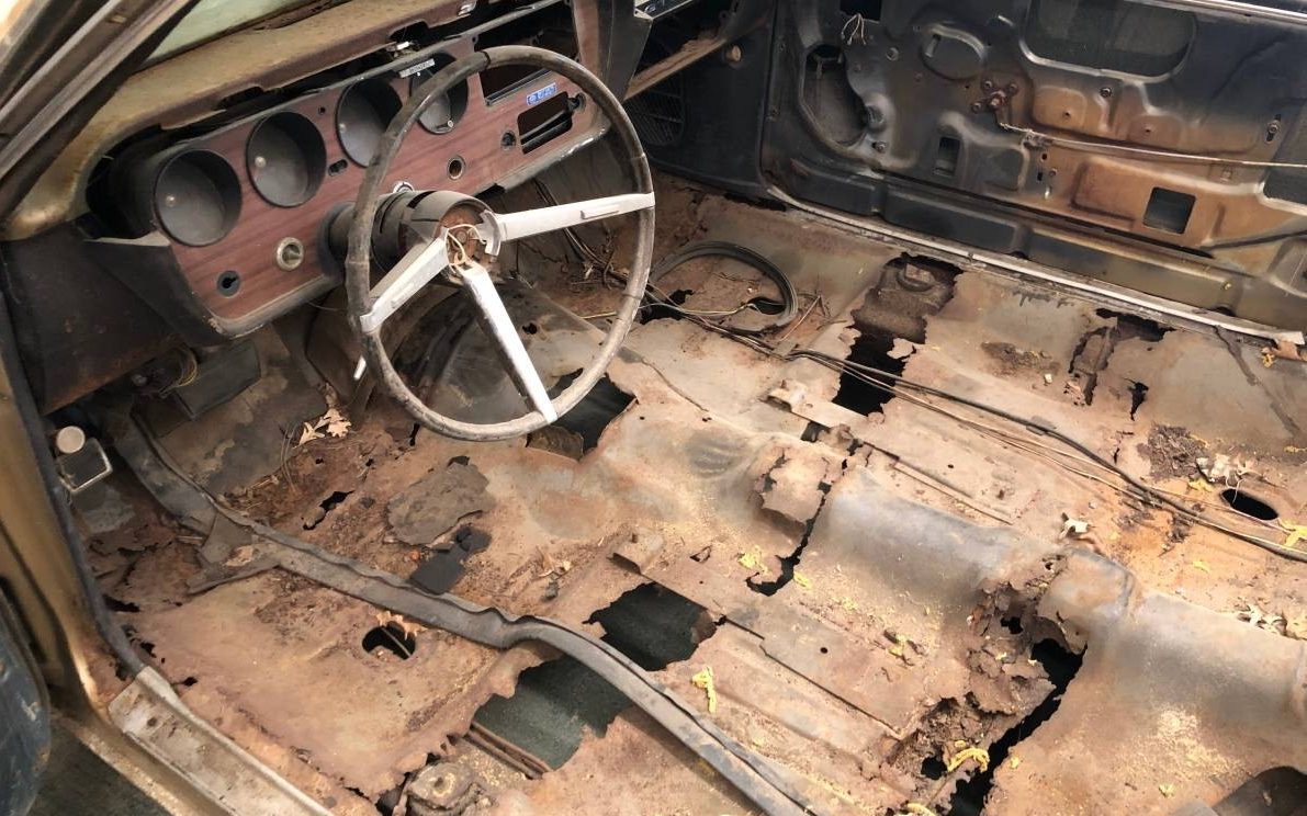 The interior may best represent potential A-body ravages, the floor pan, as well as the trunk for that matter, have become swiss cheesed. It’s unfortunate but not uncommon. The original back seat is included but the fronts (no image) have been replaced with later model GM intermediate pieces. The instrument panel is looking shaky, the gauges are obscured with dust and the radio, heater controls, and glovebox lid are missing. It’s a safe bet that the wiring harness(es) will need to be replaced.