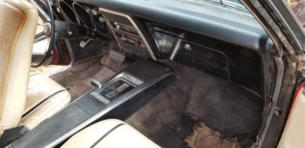 The interior needs some work, but at least it is complete. The dash looks good, and the pad isn’t cracked. Most of the interior trim looks quite good and should respond well to being cleaned. The driver’s seat will need a new cover, but the passenger seat and door trims look like they may just be okay. The console also looks to be in good condition. The owner has purchased a new carpet set which is included in the sale.