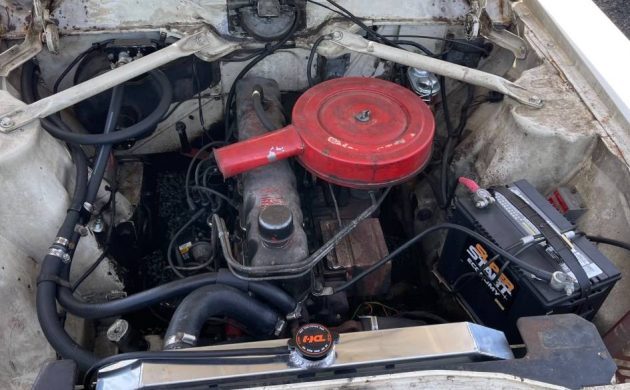 The exterior’s finish is surprisingly deep, with strong chrome and stainless trim. There’s no sign of crash damage, and as far as rust goes, the seller tells us, “Surface rust under hood and trunk lid that’s been treated to prevent corrosion.” The seller recommends that the windshield should be removed so that the weatherstripping can be replaced (leaks, maybe?). As for the blue steel wheels, no, that’s not original, but I like the look.