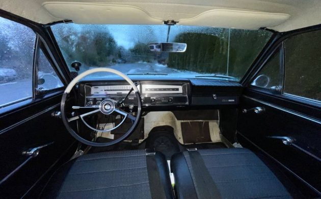 Inside, we find black vinyl and cloth upholstery covering a split bench seat and a contrasting white headliner. The environment is definitely more than AMC utilitarian, and I’d suggest typical for a mid-level car of this era. The seller states that the instrument panel circuit board and the carpet both need to be replaced.