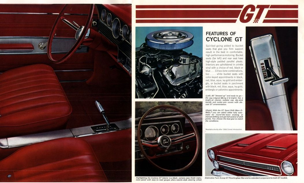 Johnny you are not correct on the automatic/4 speed transmission option for the ‘66 Cyclone GT. The heavy duty C-6 automatic “Sports Shift” was available for the -S- code 390 GT Cyclone. The standard transmission for the Cyclone GT and Fairlane GT was a floor controlled with console 3 speed stick. The 4 speed and C-6 were optional. The Fairlane GT became a GTA with the C-6 “Sport Shift”. Mercury did not designate a fender emblem change to A for an automatic equipped Cyclone GT. I have owned both a totally stock ‘66 Cyclone GT and a ‘66 Fairlane GTA (bought the Fairlane new).