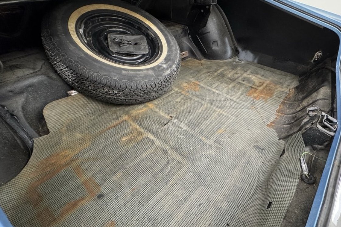 The interior is showing its age – the gold-tone color on the instrument panel is wearing off, and the bucket seat shells have yellowed. Something was screwed into the metal dash to the left of the steering wheel, leaving two holes. The headliner has a few wrinkles, and the trunk has seen better days. But the upholstery is not torn, and the carpets are decent.