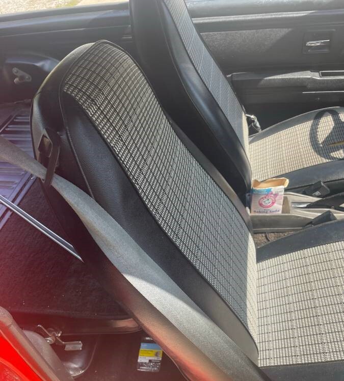 Ripped seats from a late model Vegs or Monza. 1975 bumpers- 74 models have the rubber bumper strips. Repainted with overspray.