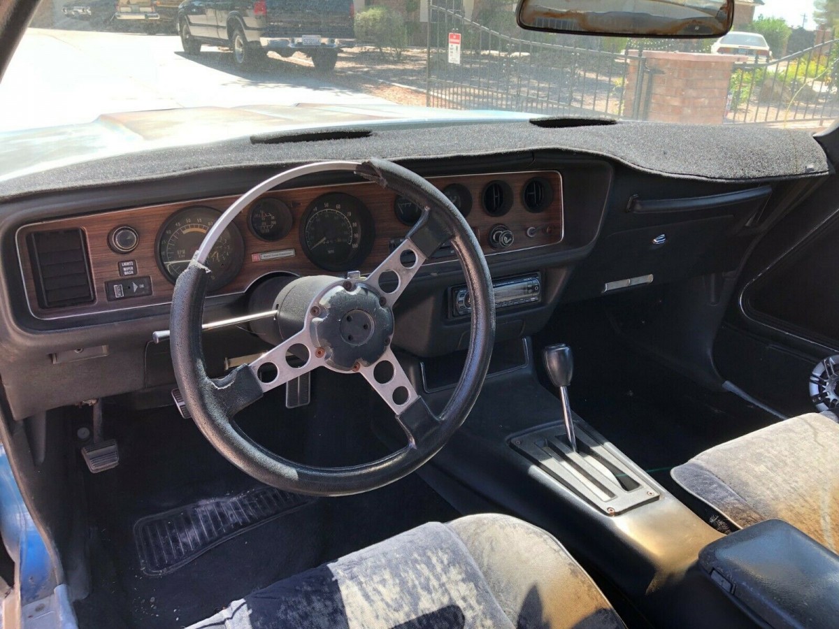The black deluxe interior shows the car was equipped with air conditioning, automatic transmission, Formula wheel and gauge package. The seat material is worn and the steering wheel is toast. With the sun damage on the interior, it will probably need a complete replacement.