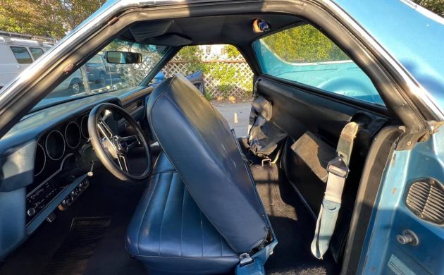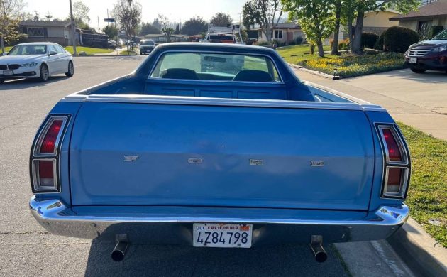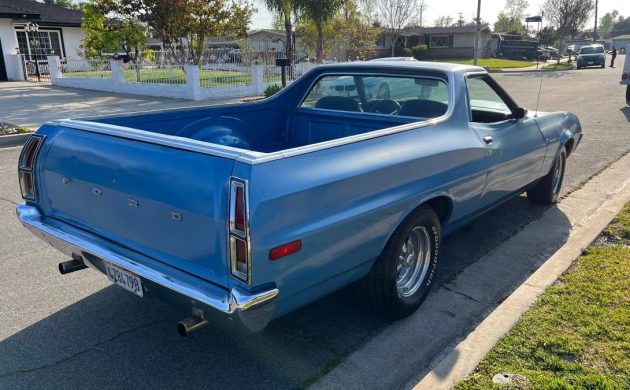 This ute’s finish looks a lot like Grabber Blue and presents beautifully. Whether it’s original or not is not stated, but my guess is that it’s a repaint. There’s no fade, no indication of rust, collision damage, or parking lot mayhem. The inside of the tailgate is a little banged up, but that’s to be expected; this Ranchero probably worked for a living at one time. While I’m not an ardent fan of Cragar S/S wheels, I’d suggest that they’re the perfect complement for this car/truck mashup.