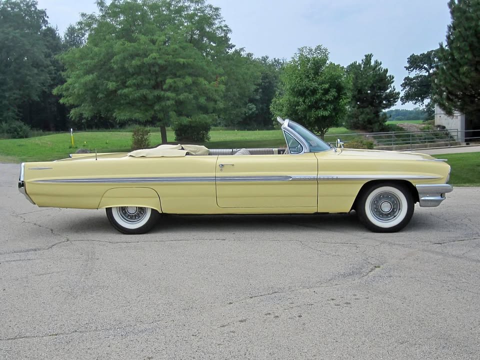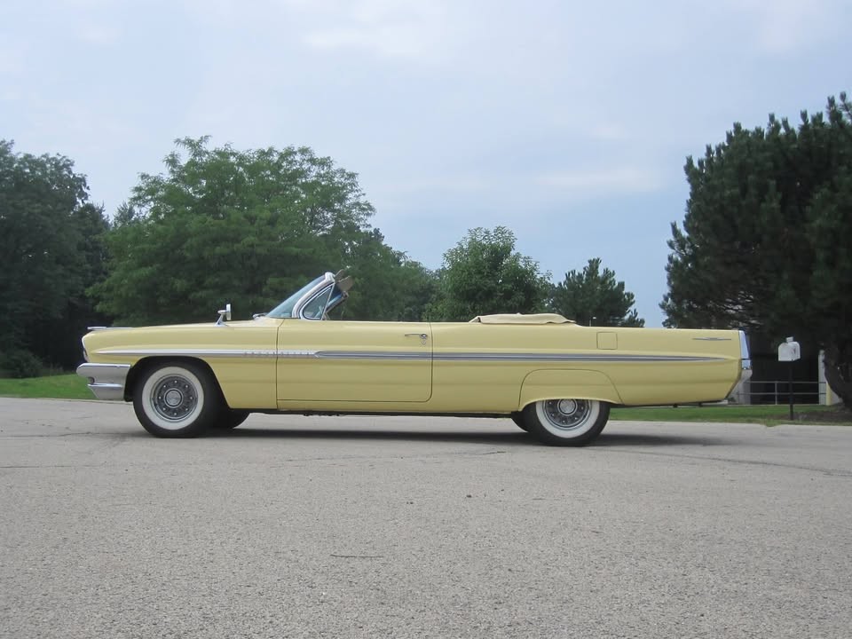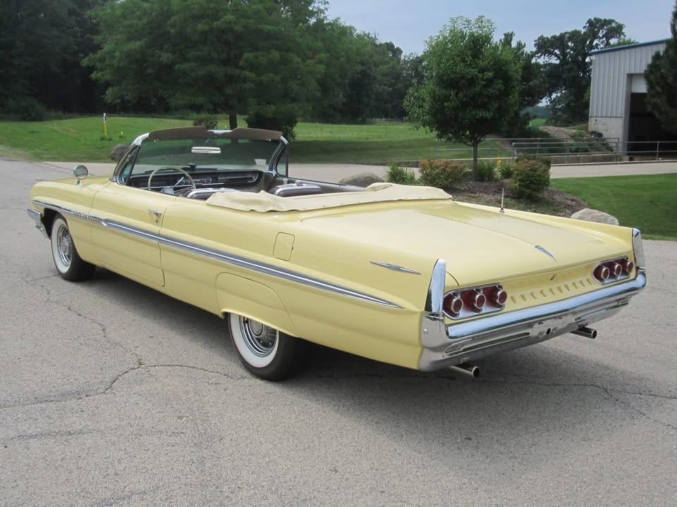 This Bonneville is gorgeous! I am a fan of yellow cars with white convertible tops & interiors. The wide whitewalls compliment the car as do the skirts. This car looks good with or without skirts. It looks sportier without but I prefer the skirts. I researched 1961 Pontiac Bonneville skirts and these are factory not aftermarket.