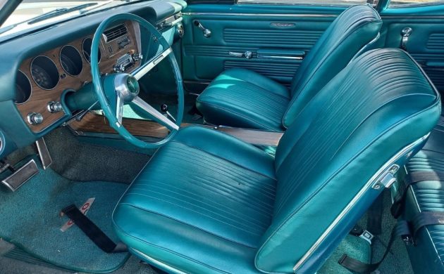 The first owner kept ticking the boxes when they focused on this GTO’s interior, adding air conditioning, bucket seats, a console, a His & Her’s shifter, and an AM radio to perfectly combine performance and comfort. The interior presents nicely for a survivor grade car, with no evidence of rips or significant wear on its Code 220 Turquoise vinyl upholstered surfaces. The dash and pad look nice, as does the console. It is worth noting that it isn’t perfect, with the carpet exhibiting some fading, but no appreciable wear. The faux woodgrain on the dash is beginning to lift and deteriorate, especially around the radio opening. The headliner is also becoming wrinkled, although the overall condition of the interior is acceptable if this GTO is viewed purely as a genuine survivor.
