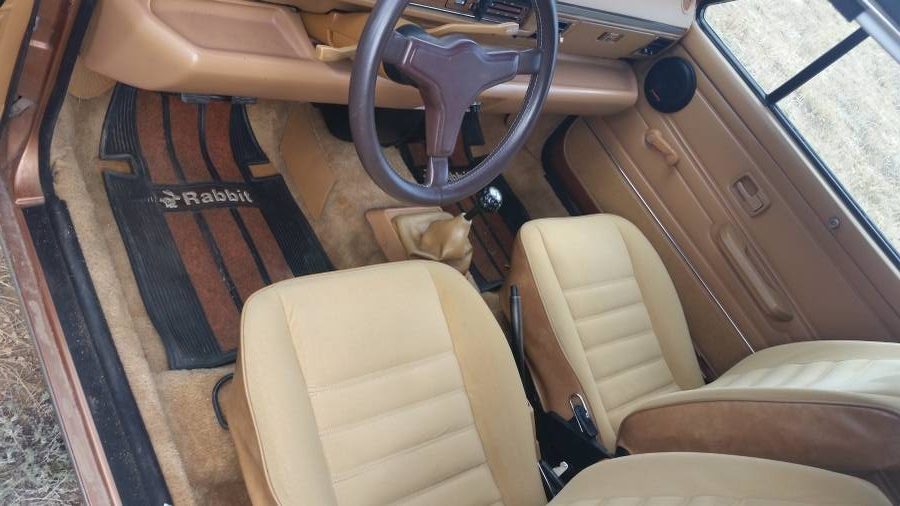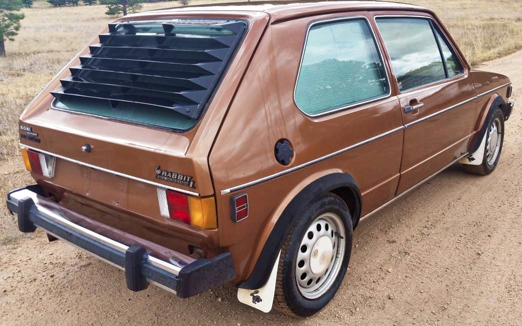 The Rabbit looks great on later MK2-style steel wheels with plastic wheel arch trim and OEM mudflaps. The body does look quite clean, and the brown paint is perfect for the era. The rear window louvers are another nice touch and indicative of styling trends at the time. While U.S. safety bumpers are awful in every application, at least the black plastic trim remains in nice shape.