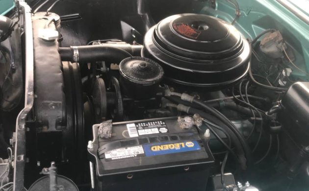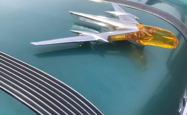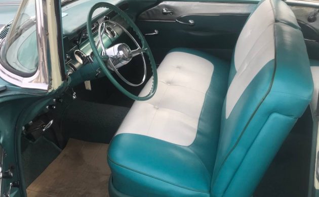 The Oh-So-1950’s turquoise and white exterior color combination is continued inside. It is tastefully color-keyed and luxurious for a top-of-the-line Pontiac, and driving comforts include power steering and power brakes. I like how the seat fabric, instrument panel, steering wheel, door panels, and carpeting harmonize together. It says upscale and colorful without being over-the-top. Like the exterior, this Pontiac’s interior is just as impressive.