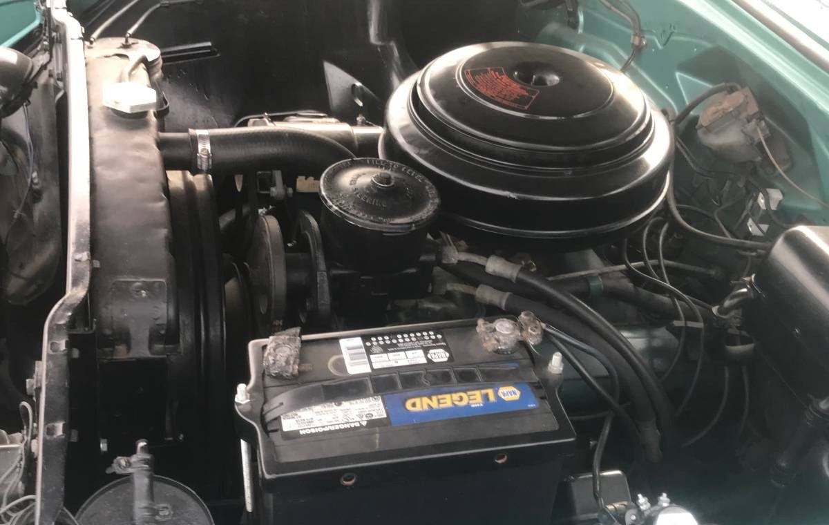 The Oh-So-1950’s turquoise and white exterior color combination is continued inside. It is tastefully color-keyed and luxurious for a top-of-the-line Pontiac, and driving comforts include power steering and power brakes. I like how the seat fabric, instrument panel, steering wheel, door panels, and carpeting harmonize together. It says upscale and colorful without being over-the-top. Like the exterior, this Pontiac’s interior is just as impressive.