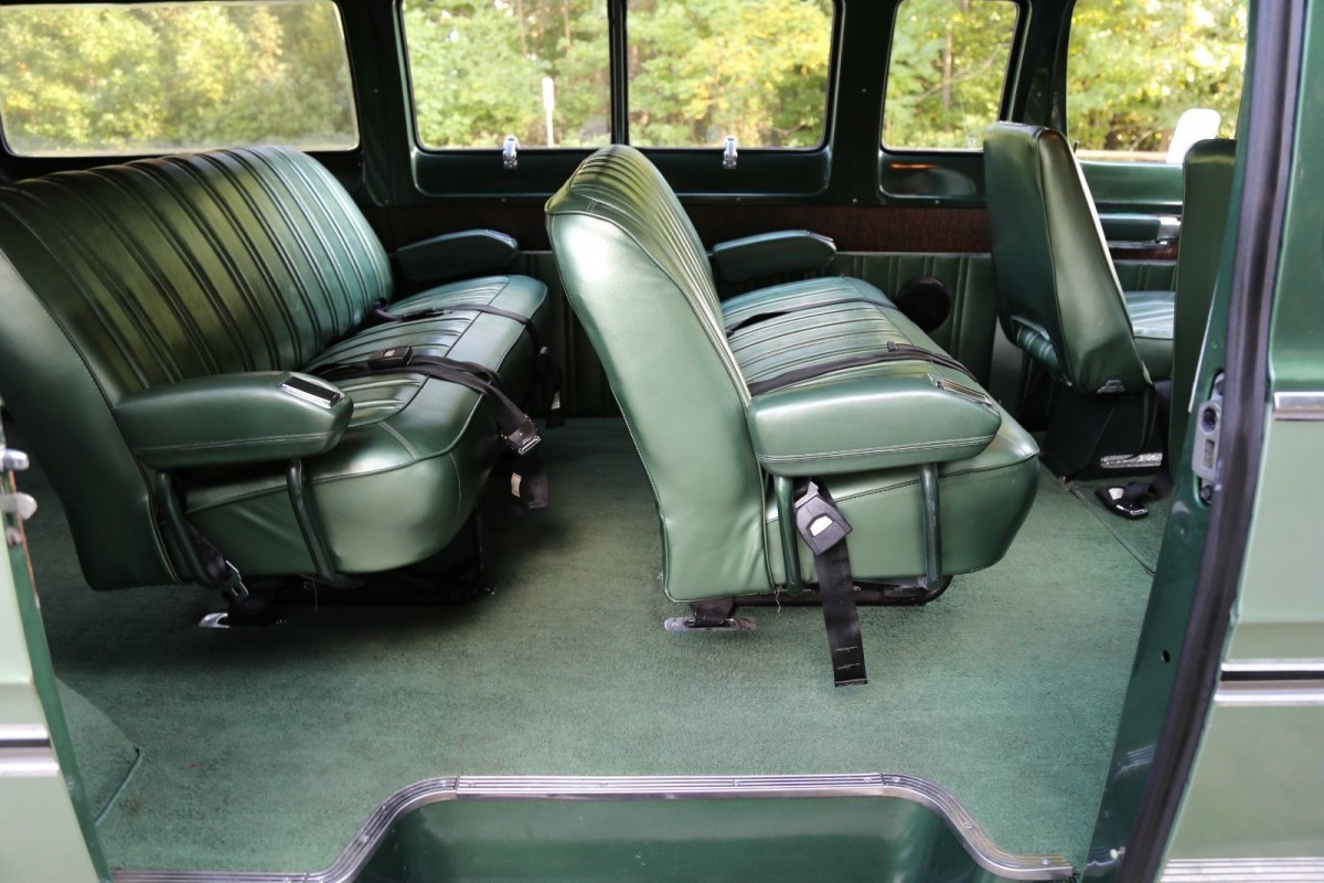 Inside, you would expect to inhale that new-car smell judging from the look of the interior components. Spotless doesn’t begin to describe the perfection found inside this incredible van. The funky wood-look vinyl trim helps to break up the acres of green vinyl panels and green painted surfaces. It’s also amusing to see the number of ashtrays available to the passengers when today we’re looking for cup holders. The van is set up for eight passengers and there is a ton of space behind the rear seat.