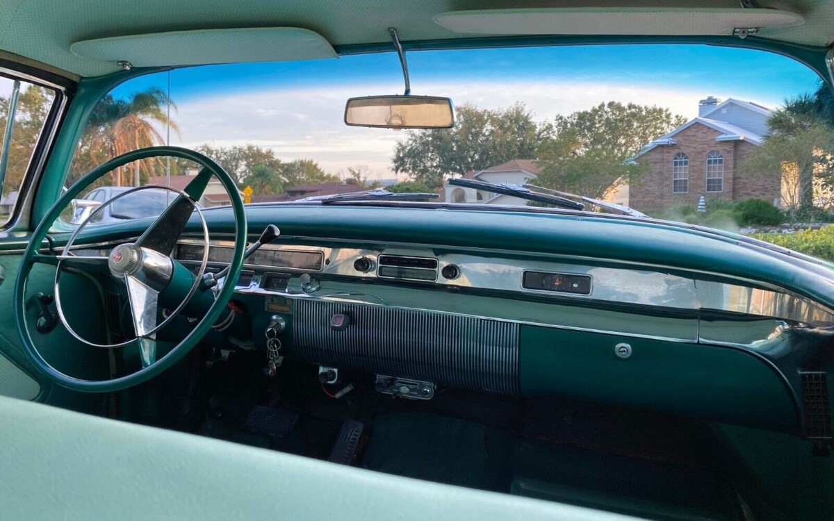 I believe that the fifty era cars were the king of tu-tone automobiles. This is a great color combination, but I could think of a better interior color other than green. 4 door cars for some reason look just as good as coupes which is an oddity. It just seems to flow better and the tu-tone and trim set each other off flawlessly.I was born in 1963, and I remember seeing these and liking them, especially the ports on the side. Later generations seemed like they just added 2 more doors with no thought of how they looked awkward. But all cars were big then, but by the late sixties early seventies, smaller cars looked weird. As I got old enough to drive, you couldn’t give me one. This is a beautiful car, it would surely command attention.