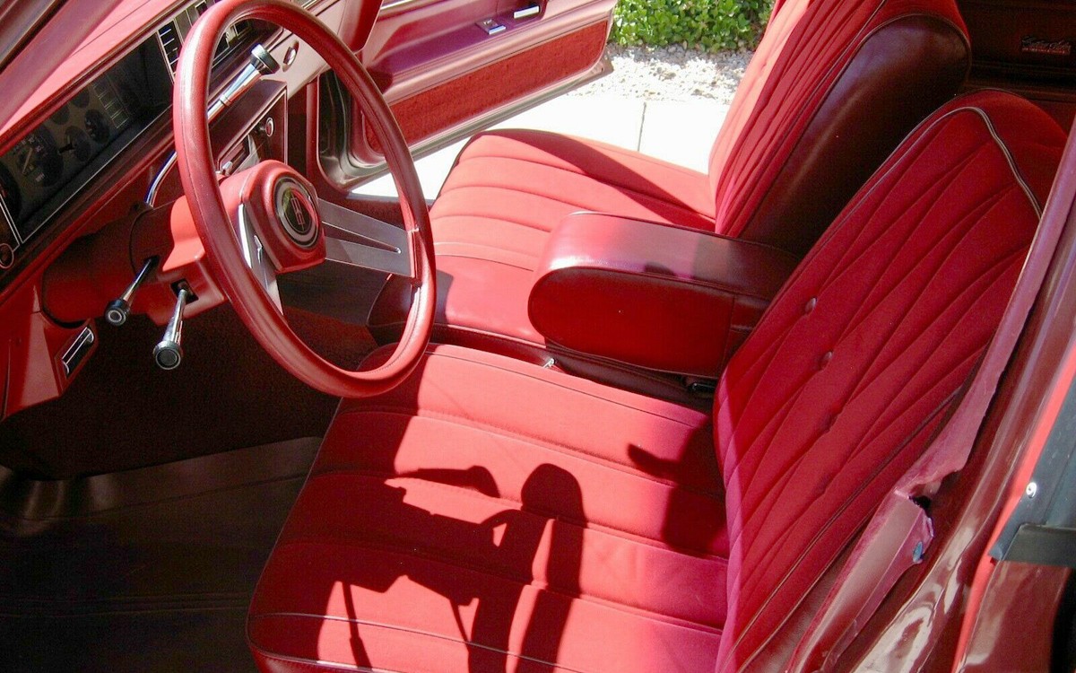 The beautiful red velour (yes, those three words coexist in my world) interior looks almost perfect other than some damage on one of the b-pillars maybe? I can’t quite tell where this photo was taken other than seeing a seatbelt there. The back seat looks comfy and I’m guessing the headroom and legroom are both plentiful even for those of us who are well over six feet tall. The seller mentions that one of the rear power windows doesn’t open due to a broken cable, and they also say that the AC works like a charm and it sounds like everything else is functioning.